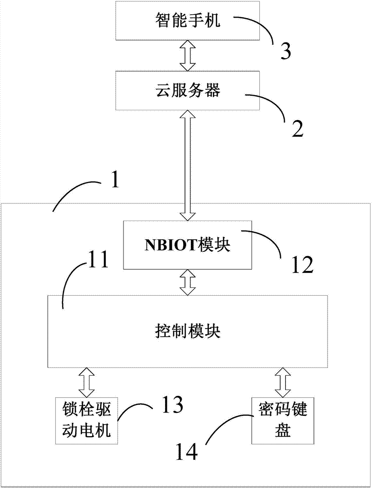 控制模塊11控制所述鎖體解鎖或鎖付,通信模塊12采用窄帶物聯(lián)網(wǎng)通信模塊(即NBIOT模塊),控制模塊11通過NBIOT模塊與一個云服務器2直接通信。因此,智能手機3就可以很快捷的通過云服務器2實現(xiàn)對互聯(lián)網(wǎng)智能門鎖1的運行與管理。